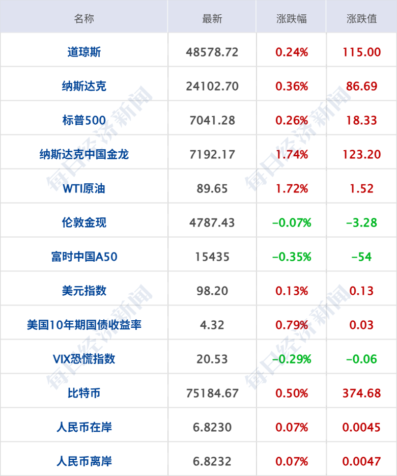 美股三大指数集体收涨,纳指涨0.36%续创新高,为连续12个交易日上涨,标普500指数涨0.26%也创历史新高,道指涨0.24%,热门科技股多数上涨,AMD涨超7%,英特尔涨超5%,微软涨超2%。锂矿概念股、锂电池、计算机硬件涨幅居前,美国雅保涨超16%,戴尔科技涨近9%,Lithium涨超6%,超微电脑涨超4%,闪迪涨超3%,惠普、希捷科技涨超2%。中概股多数上涨,纳斯达克中国金龙指数涨1.74%,蔚来涨7%,好未来、新东方涨逾5%,阿里巴巴涨逾4%,百度集团、小鹏汽车涨超3%,老虎证券、百胜中国跌超1%。