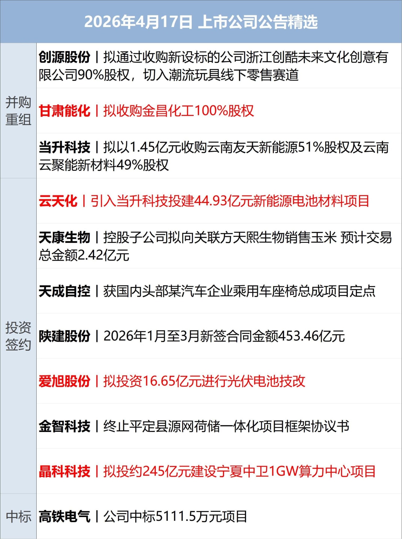 晶科科技(SH601778,股价6.66元,市值238亿元):4月16日晚,上交所就晶科电力科技股份有限公司签署投资协议相关事项发出监管工作函,涉及对象为上市公司、董事、高级管理人员。同日,晶科科技公告,公司与中卫市人民政府签署《投资协议》,就宁夏中卫1GW算力中心项目达成合作意向。该项目计划总投资约245亿元,占地约800亩,计划部署机柜约5万架,分三期建设。