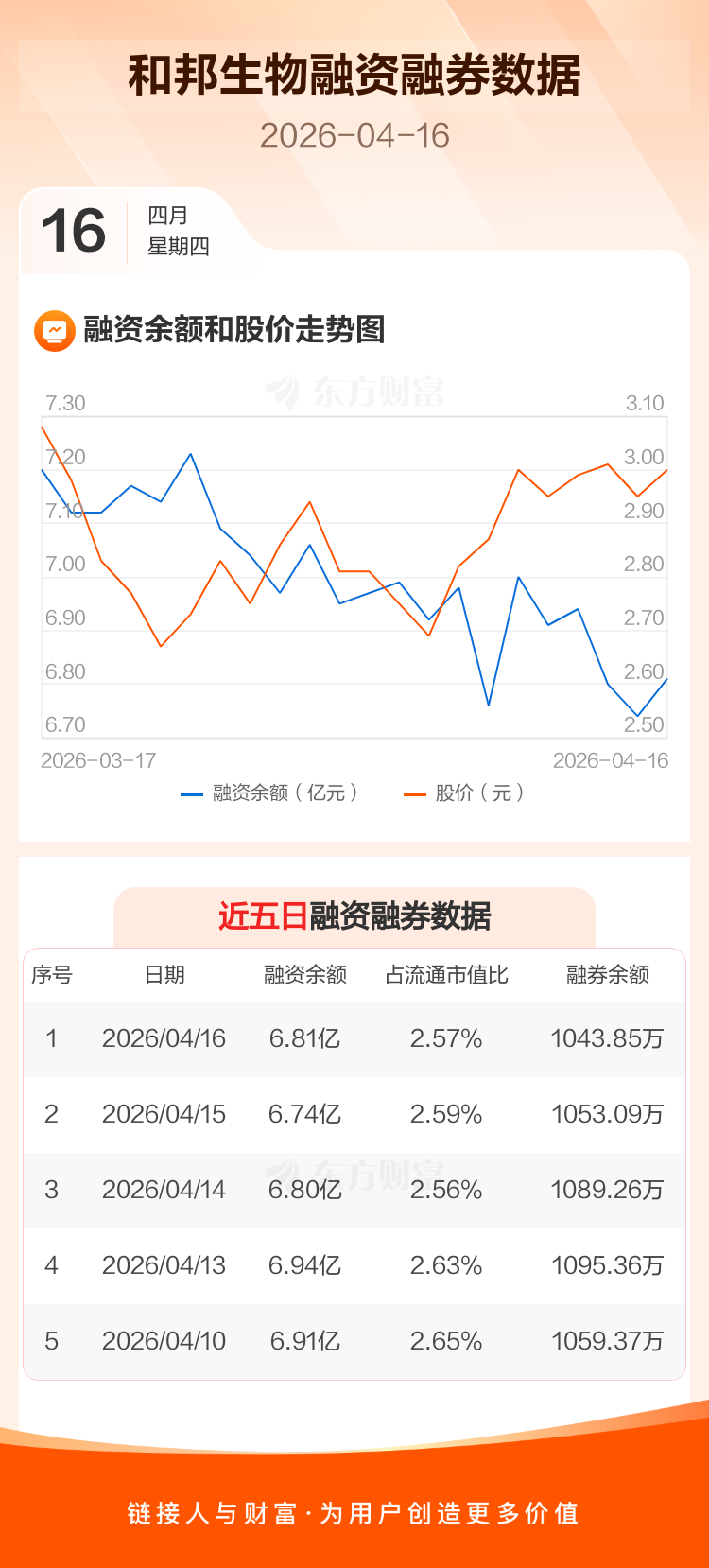 交易所最新数据显示,和邦生物于2026年4月16日获融资买入5404.05万元,融资偿还4797.01万元,当日融资净买入607.05万元。目前,该股融资余额6.81亿,占流通市值比例为2.57%。