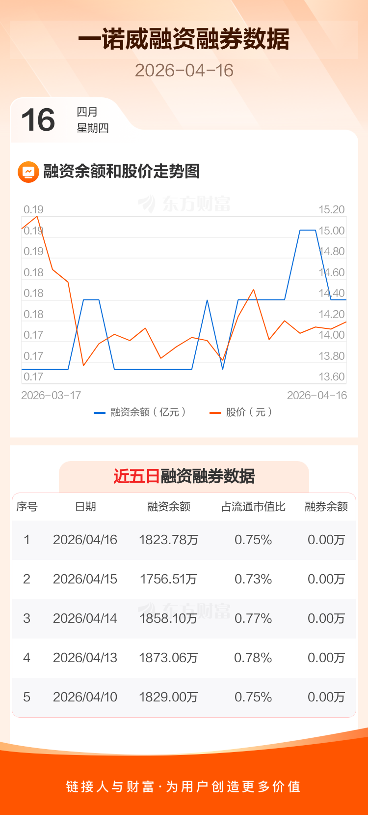 交易所最新数据显示,一诺威于2026年4月16日获融资买入111.21万元,融资偿还43.94万元,当日融资净买入67.27万元。目前,该股融资余额1823.78万,占流通市值比例为0.75%。