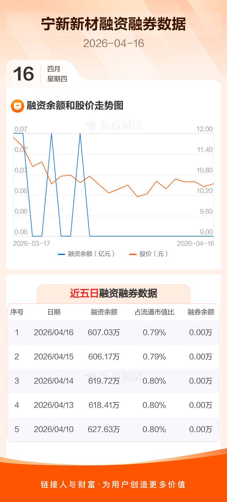 交易所最新数据显示,宁新新材于2026年4月16日获融资买入19.57万元,融资偿还18.71万元,当日融资净买入8635元。目前,该股融资余额607.03万,占流通市值比例为0.79%。