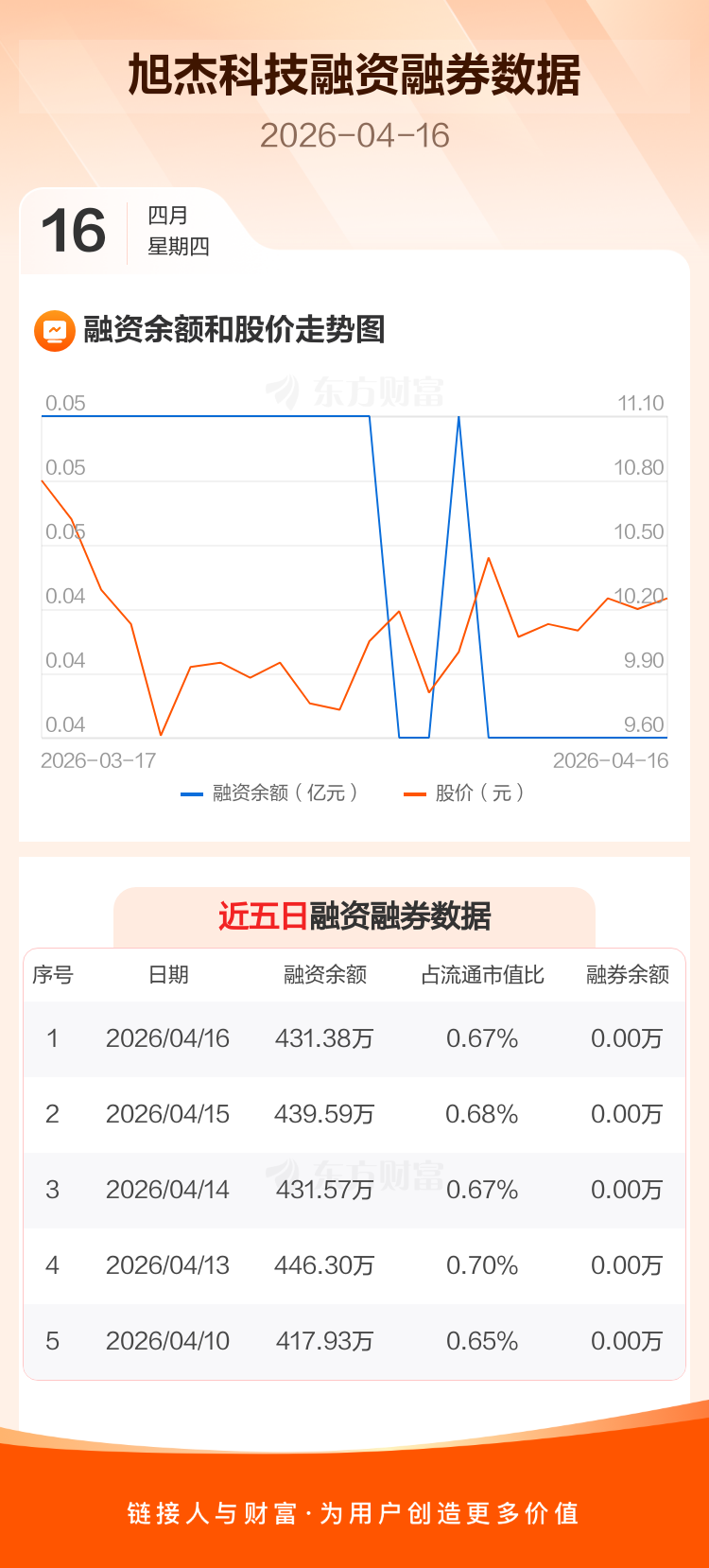 交易所最新数据显示,旭杰科技于2026年4月16日获融资买入6.98万元,融资偿还15.19万元,当日融资净偿还8.21万元。目前,该股融资余额431.38万,占流通市值比例为0.67%。