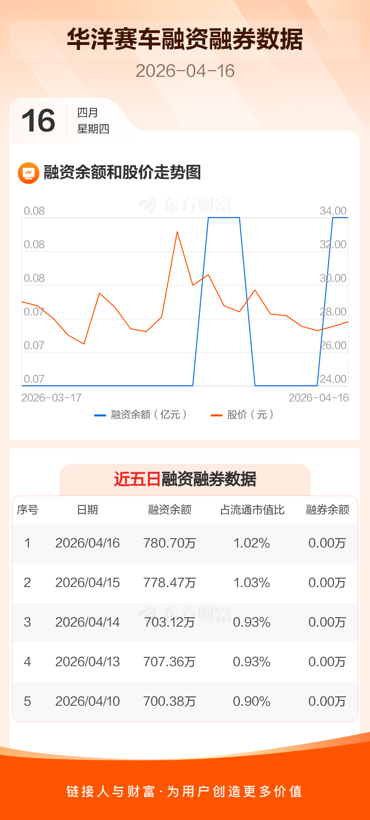 交易所最新数据显示,华洋赛车于2026年4月16日获融资买入110.04万元,融资偿还107.81万元,当日融资净买入2.23万元。目前,该股融资余额780.70万,占流通市值比例为1.02%。