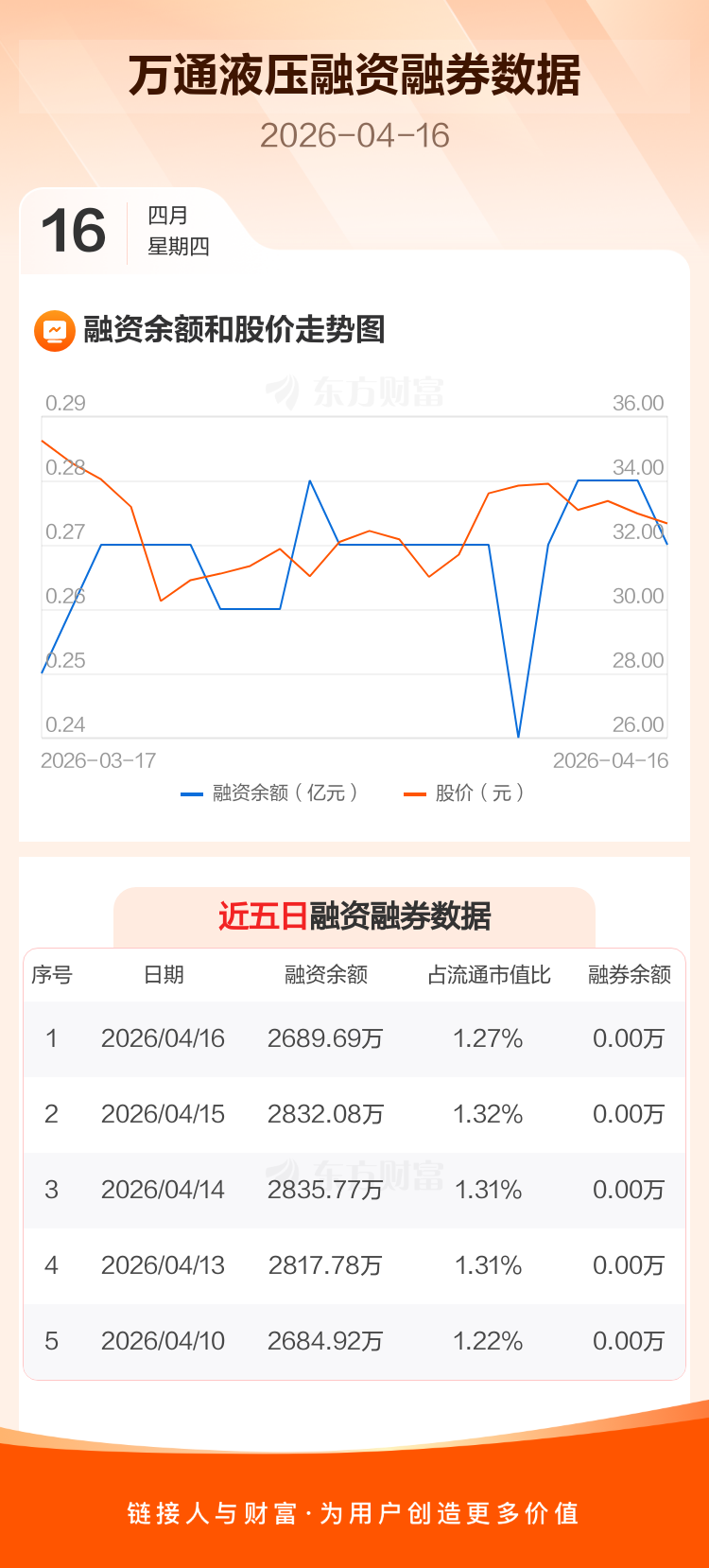 交易所最新数据显示,万通液压于2026年4月16日获融资买入101.71万元,融资偿还244.10万元,当日融资净偿还142.4万元。目前,该股融资余额2689.69万,占流通市值比例为1.27%。