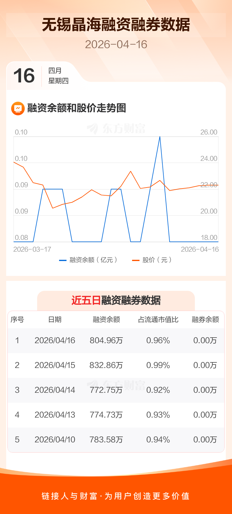 交易所最新数据显示,无锡晶海于2026年4月16日获融资买入5.64万元,融资偿还33.54万元,当日融资净偿还27.9万元。目前,该股融资余额804.96万,占流通市值比例为0.96%。