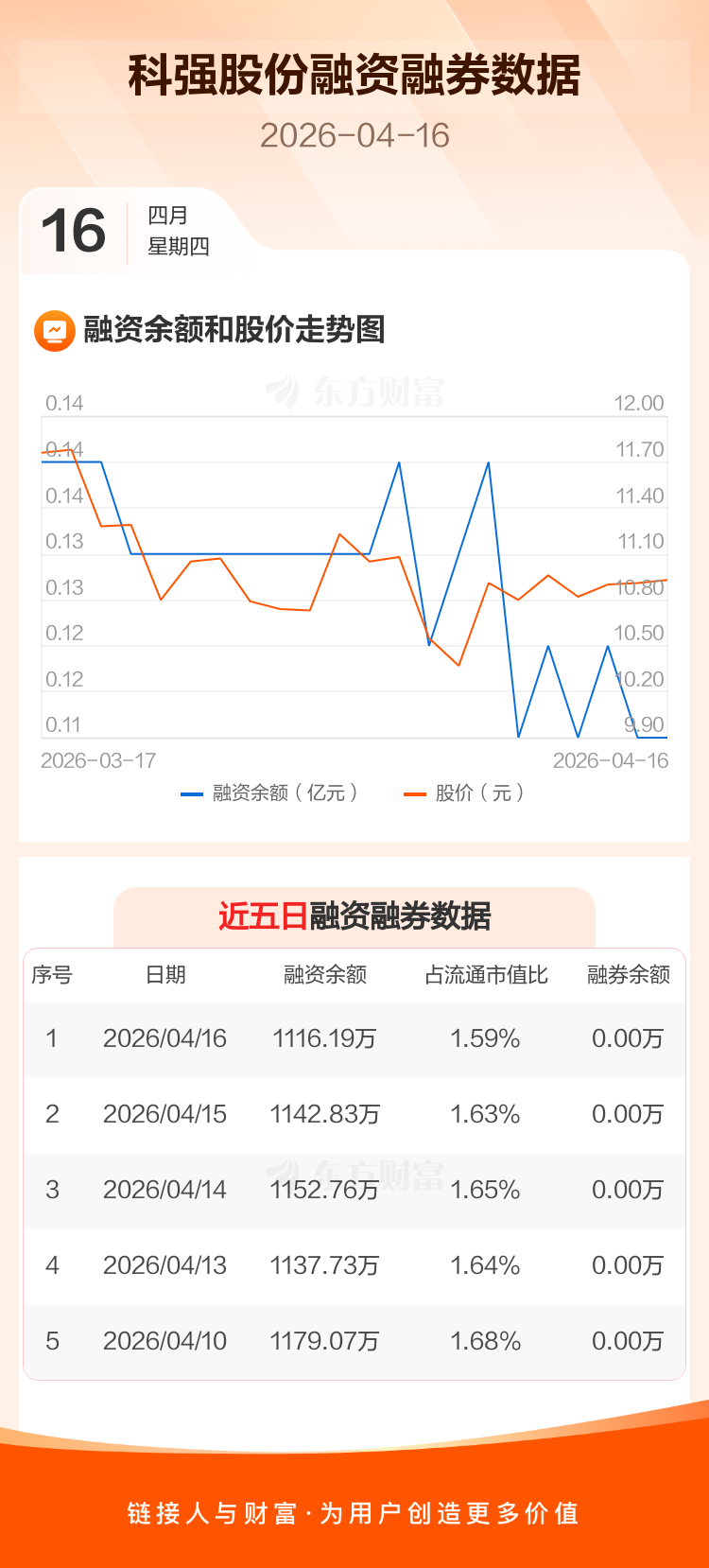 交易所最新数据显示,科强股份于2026年4月16日获融资买入79.99万元,融资偿还106.63万元,当日融资净偿还26.64万元。目前,该股融资余额1116.19万,占流通市值比例为1.59%。