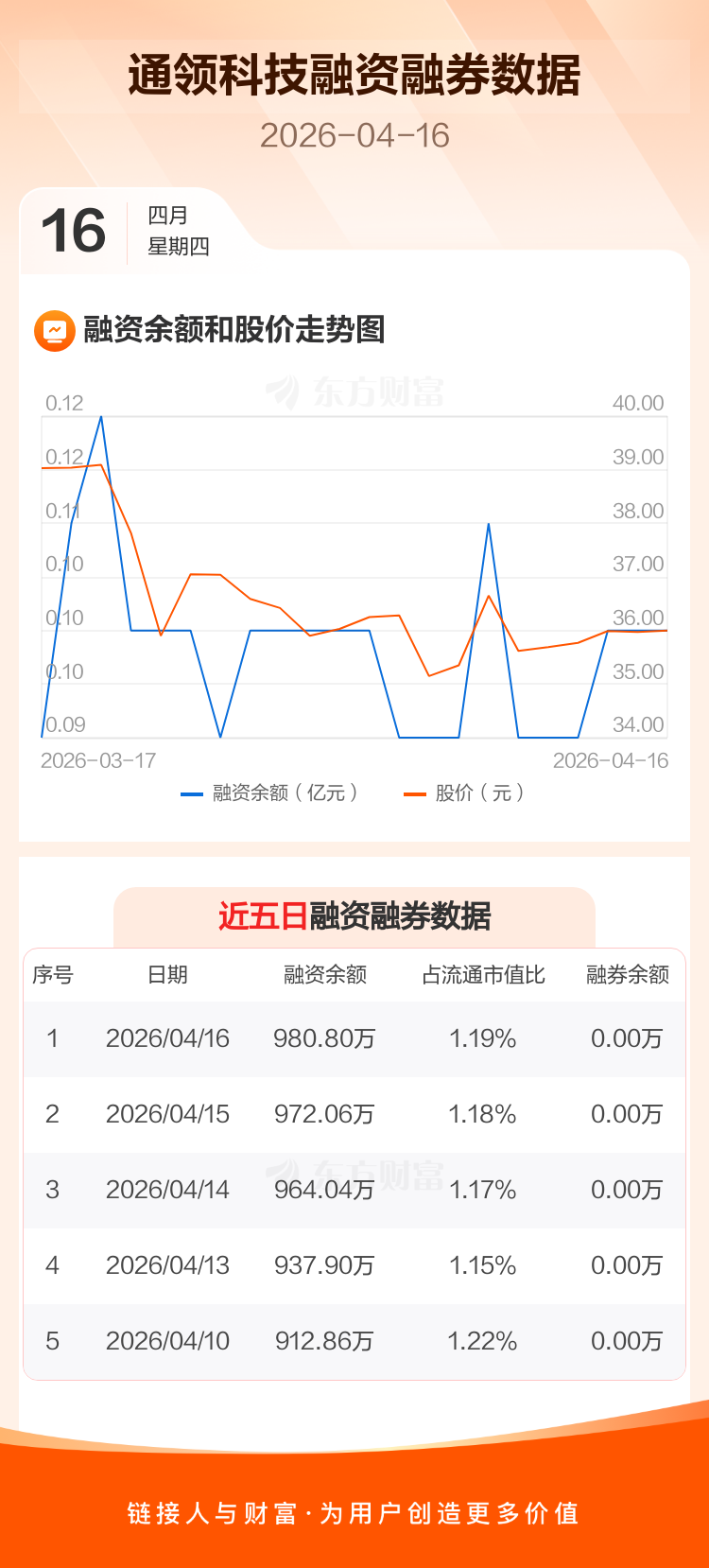 交易所最新数据显示,通领科技于2026年4月16日获融资买入16.58万元,融资偿还7.84万元,当日融资净买入8.74万元。目前,该股融资余额980.80万,占流通市值比例为1.19%。