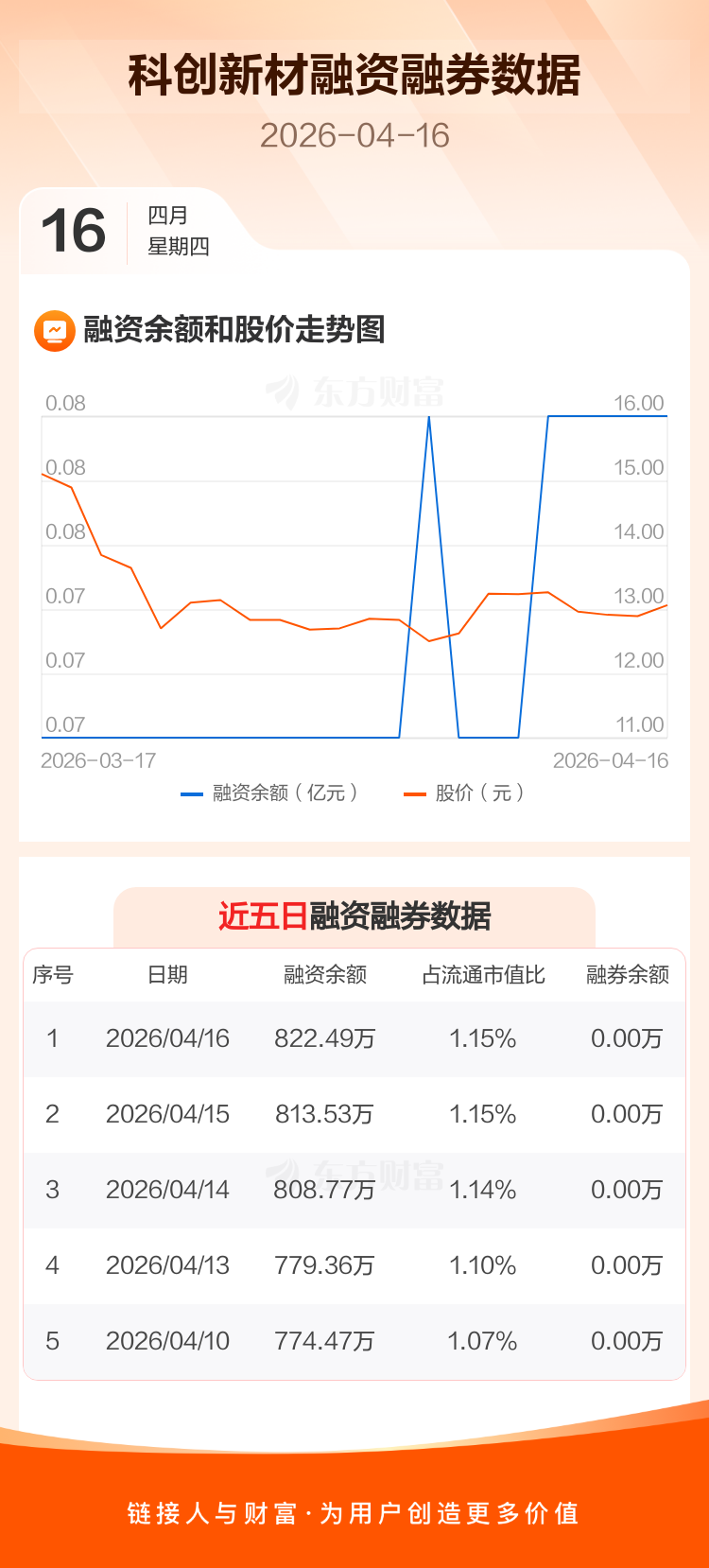 交易所最新数据显示,科创新材于2026年4月16日获融资买入17.72万元,融资偿还8.76万元,当日融资净买入8.96万元。目前,该股融资余额822.49万,占流通市值比例为1.15%。
