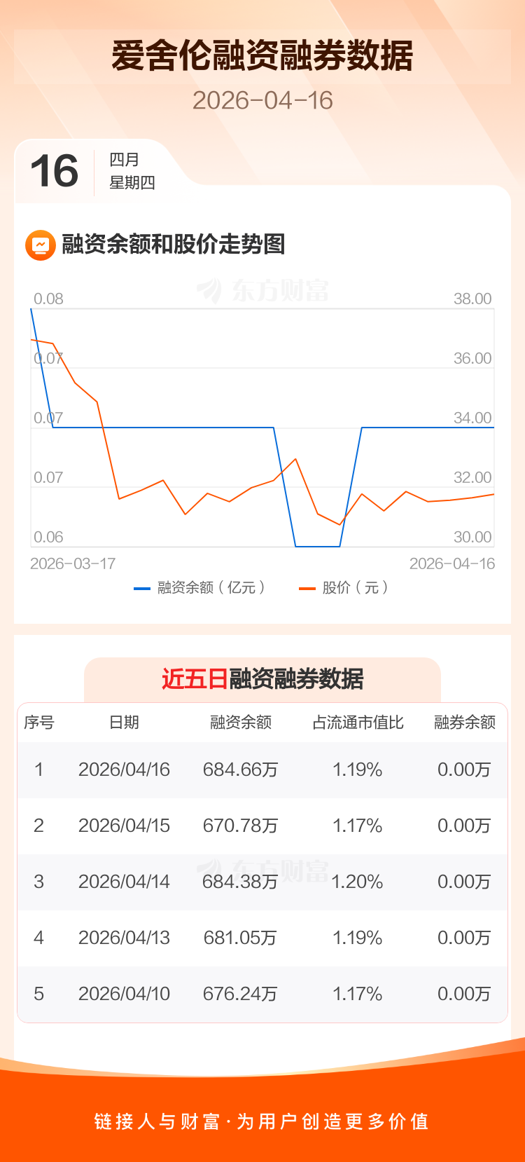 交易所最新数据显示,爱舍伦于2026年4月16日获融资买入270.59万元,融资偿还256.72万元,当日融资净买入13.88万元。目前,该股融资余额684.66万,占流通市值比例为1.19%。