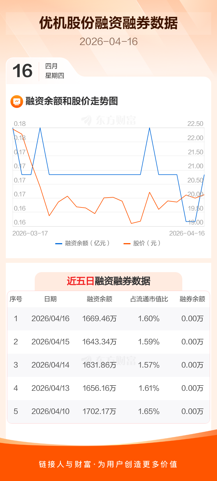 交易所最新数据显示,优机股份于2026年4月16日获融资买入115.65万元,融资偿还89.53万元,当日融资净买入26.12万元。目前,该股融资余额1669.46万,占流通市值比例为1.60%。