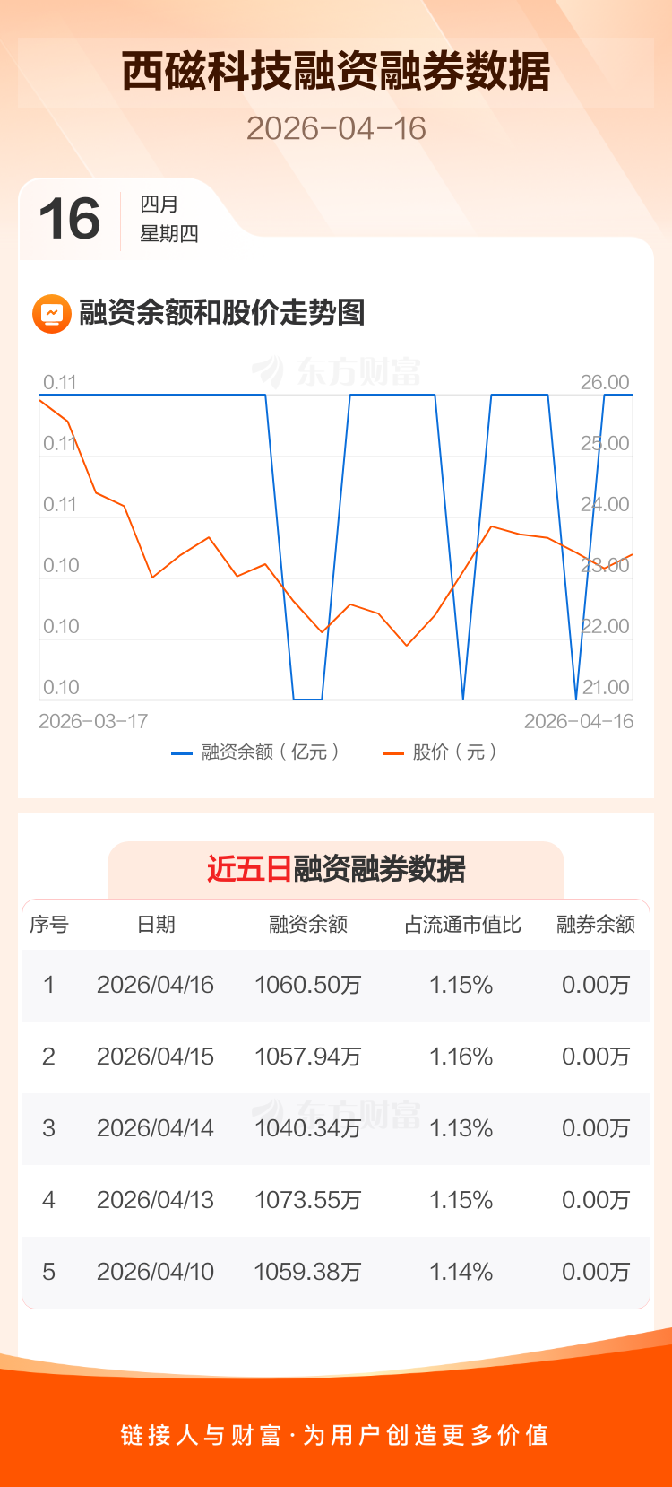 交易所最新数据显示,西磁科技于2026年4月16日获融资买入17.12万元,融资偿还14.56万元,当日融资净买入2.56万元。目前,该股融资余额1060.50万,占流通市值比例为1.15%。