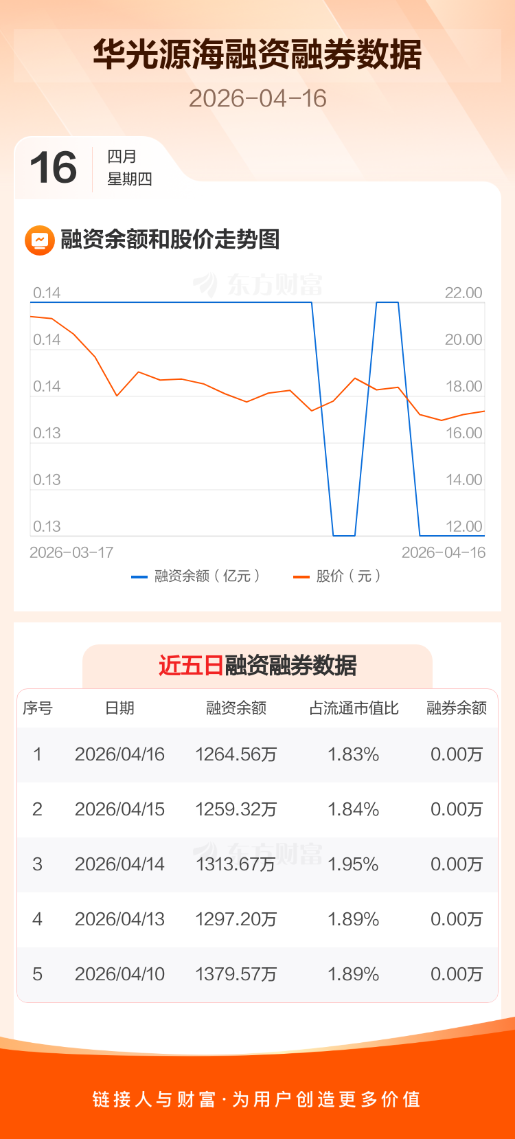 交易所最新数据显示,华光源海于2026年4月16日获融资买入64.37万元,融资偿还59.12万元,当日融资净买入5.25万元。目前,该股融资余额1264.56万,占流通市值比例为1.83%。