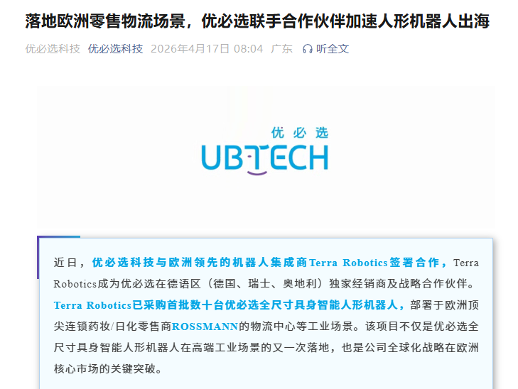 优必选与Terra Robotics签署合作 人形机器人落地欧洲零售物流场景