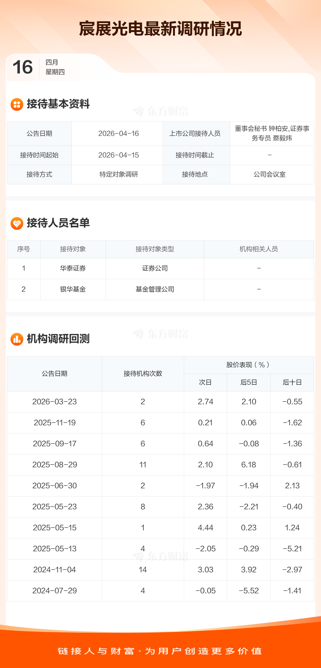 宸展光电4月16日公告称,4月15日接待华泰证券等2家机构调研。接待人员包括董事会秘书 钟柏安,证券事务专员 蔡毅炜。