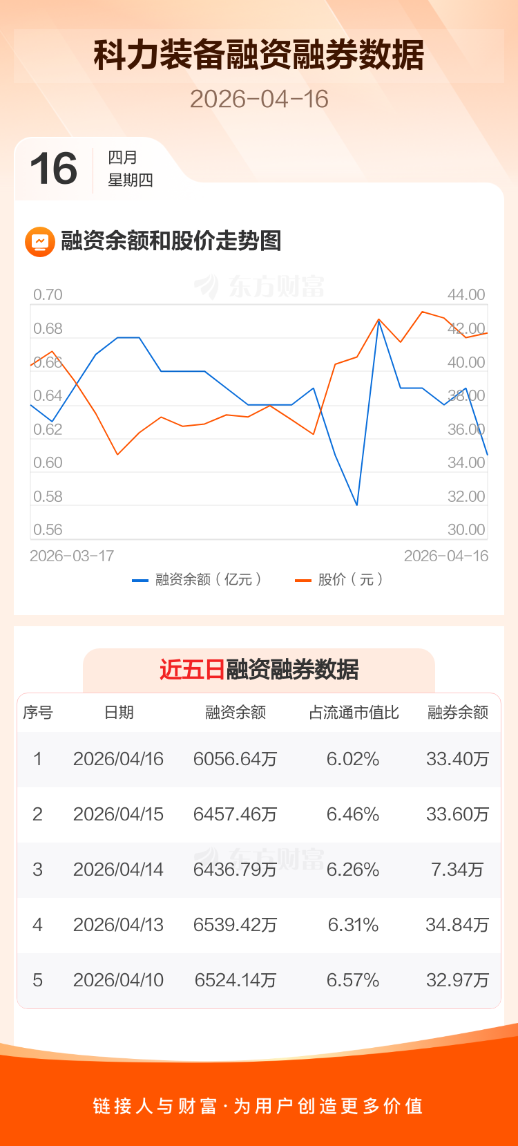 交易所最新数据显示,科力装备于2026年4月16日获融资买入645.02万元,融资偿还1045.85万元,当日融资净偿还400.83万元。目前,该股融资余额6056.64万,占流通市值比例为6.02%。