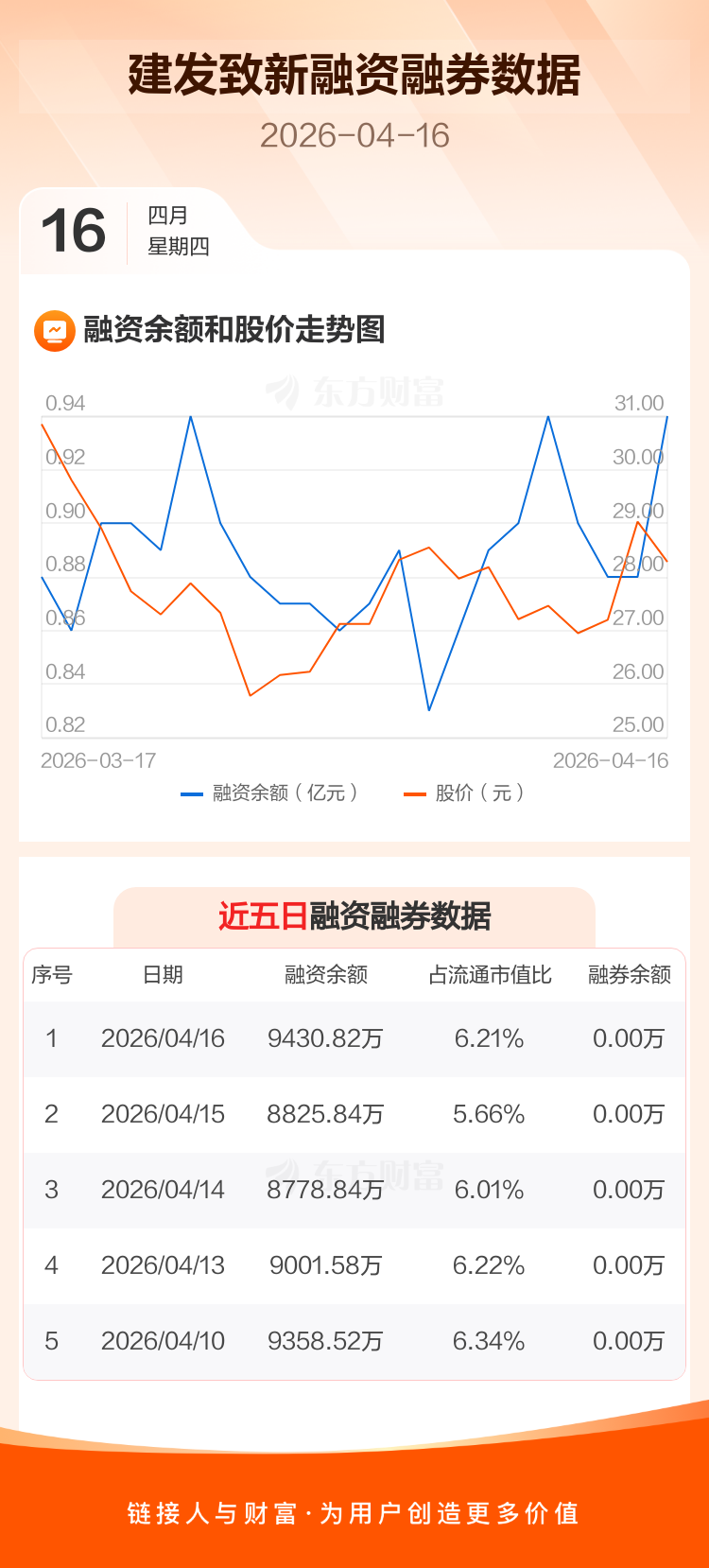 交易所最新数据显示,建发致新于2026年4月16日获融资买入1917.77万元,融资偿还1312.80万元,当日融资净买入604.97万元。目前,该股融资余额9430.82万,占流通市值比例为6.21%。