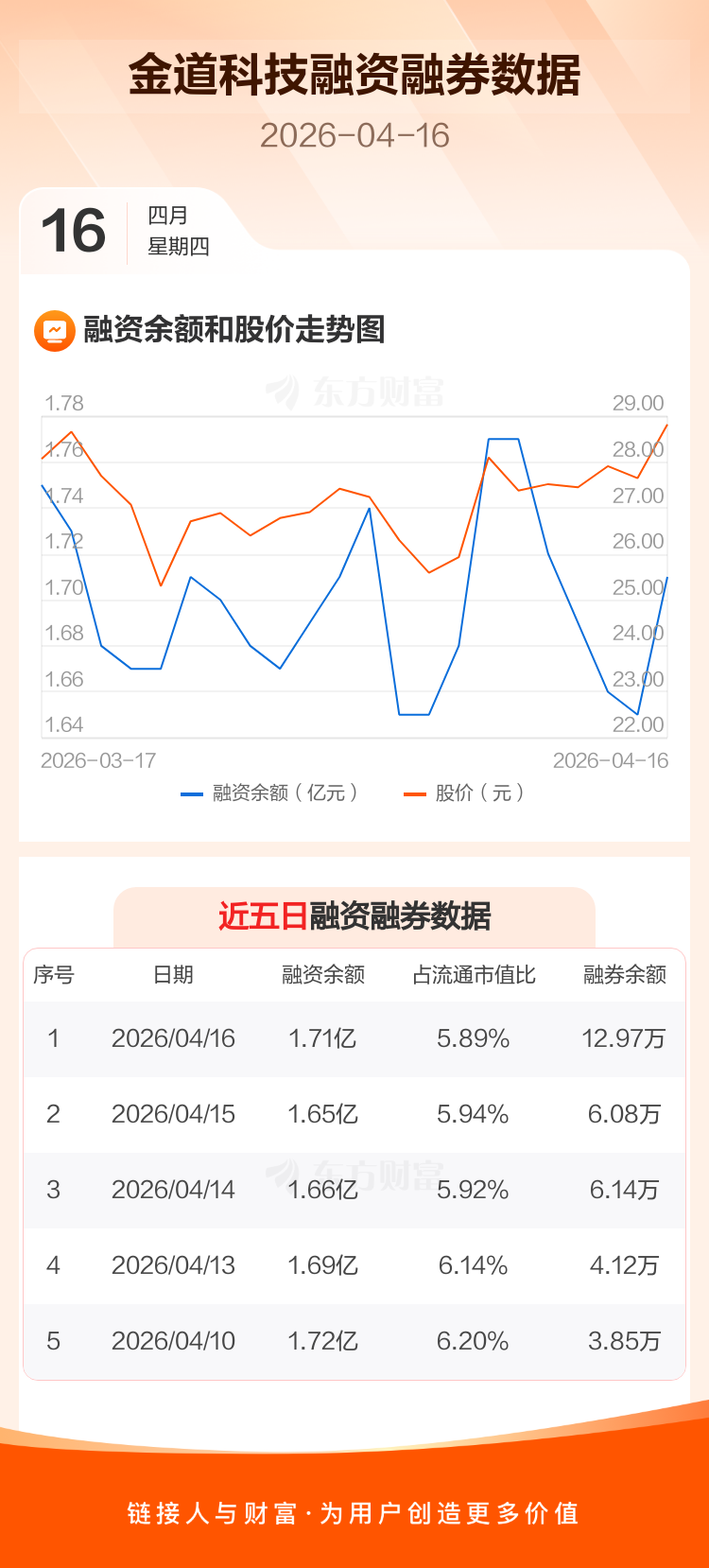 交易所最新数据显示,金道科技于2026年4月16日获融资买入1031.29万元,融资偿还457.46万元,当日融资净买入573.82万元。目前,该股融资余额1.71亿,占流通市值比例为5.89%。