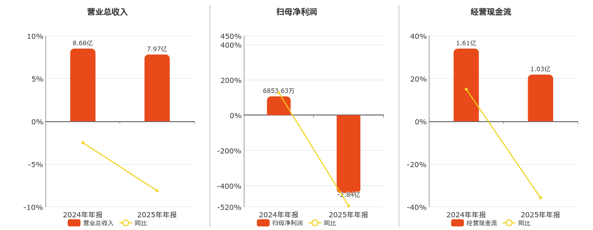 公司营业总收入为7.97亿元,较去年同报告期营业总收入减少7042.97万元,同比较去年同期下降8.12%。归母净利润为-2.84亿元,较去年同报告期归母净利润减少3.53亿元,同比较去年同期下降515.01%。经营活动现金净流入为1.03亿元,较去年同报告期经营活动现金净流入减少5749.00万元,同比较去年同期下降35.76%。