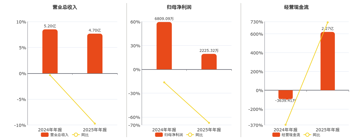 公司营业总收入为4.70亿元,较去年同报告期营业总收入减少5062.76万元,同比较去年同期下降9.73%。归母净利润为2225.32万元,较去年同报告期归母净利润减少4583.77万元,同比较去年同期下降67.32%。经营活动现金净流入为2.27亿元。