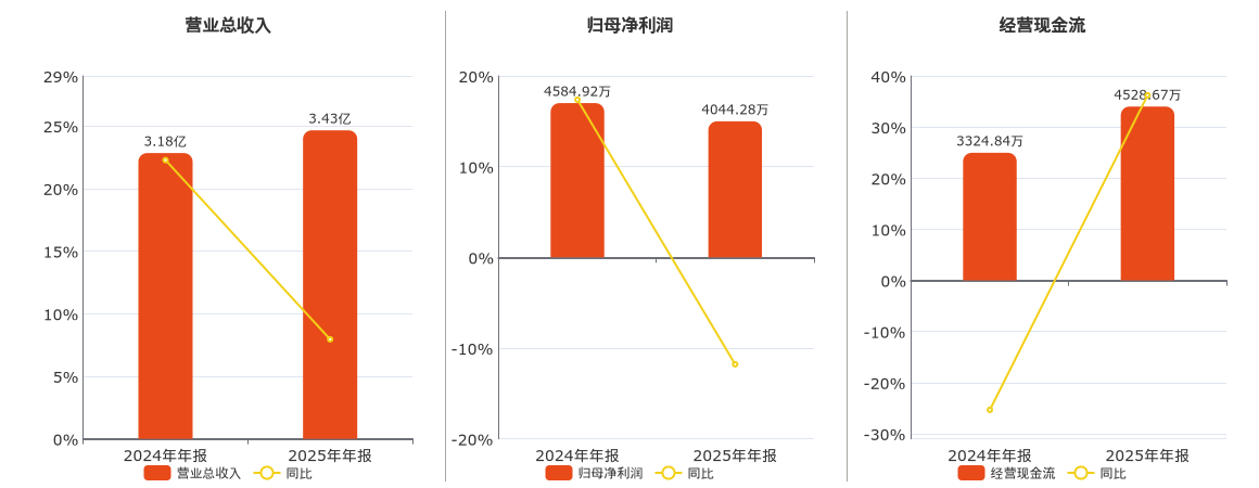 公司营业总收入为3.43亿元。归母净利润为4044.28万元,较去年同报告期归母净利润减少540.64万元,同比较去年同期下降11.79%。经营活动现金净流入为4528.67万元。