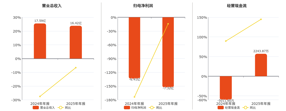 公司营业总收入为16.42亿元,较去年同报告期营业总收入减少1.17亿元,同比较去年同期下降6.63%。归母净利润为-7.32亿元,较去年同报告期归母净利润减少9153.91万元。经营活动现金净流入为2243.87万元。