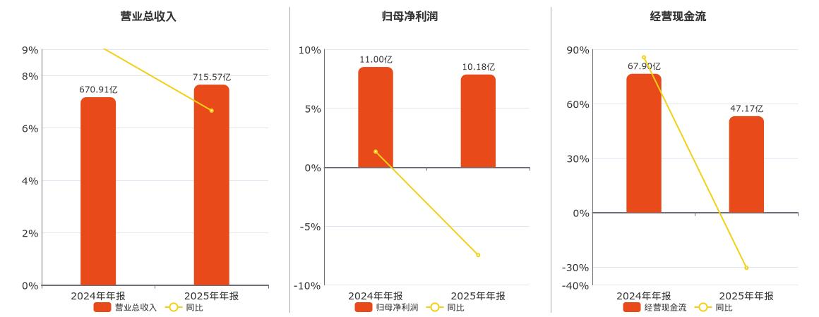 公司营业总收入为715.57亿元。归母净利润为10.18亿元,较去年同报告期归母净利润减少8161.11万元,同比较去年同期下降7.42%。经营活动现金净流入为47.17亿元,较去年同报告期经营活动现金净流入减少20.73亿元,同比较去年同期下降30.53%。