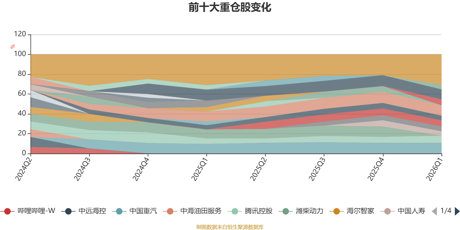 该基金持股集中度较高,近2年前十大重仓股集中度长期超过60%。截至2026年一季度末,基金十大重仓股分别是中国重汽、青岛港、美的集团、腾讯控股、第一拖拉机股份、中国太保、工商银行、宇通客车、香港交易所、中国人寿。