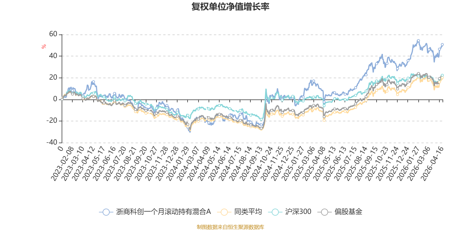 截至4月16日,浙商科创一个月滚动持有混合A近三个月复权单位净值增长率为0.28%,位于同类可比基金366/689;近半年复权单位净值增长率为12.78%,位于同类可比基金259/689;近一年复权单位净值增长率为45.70%,位于同类可比基金269/685;近三年复权单位净值增长率为31.45%,位于同类可比基金137/421。
