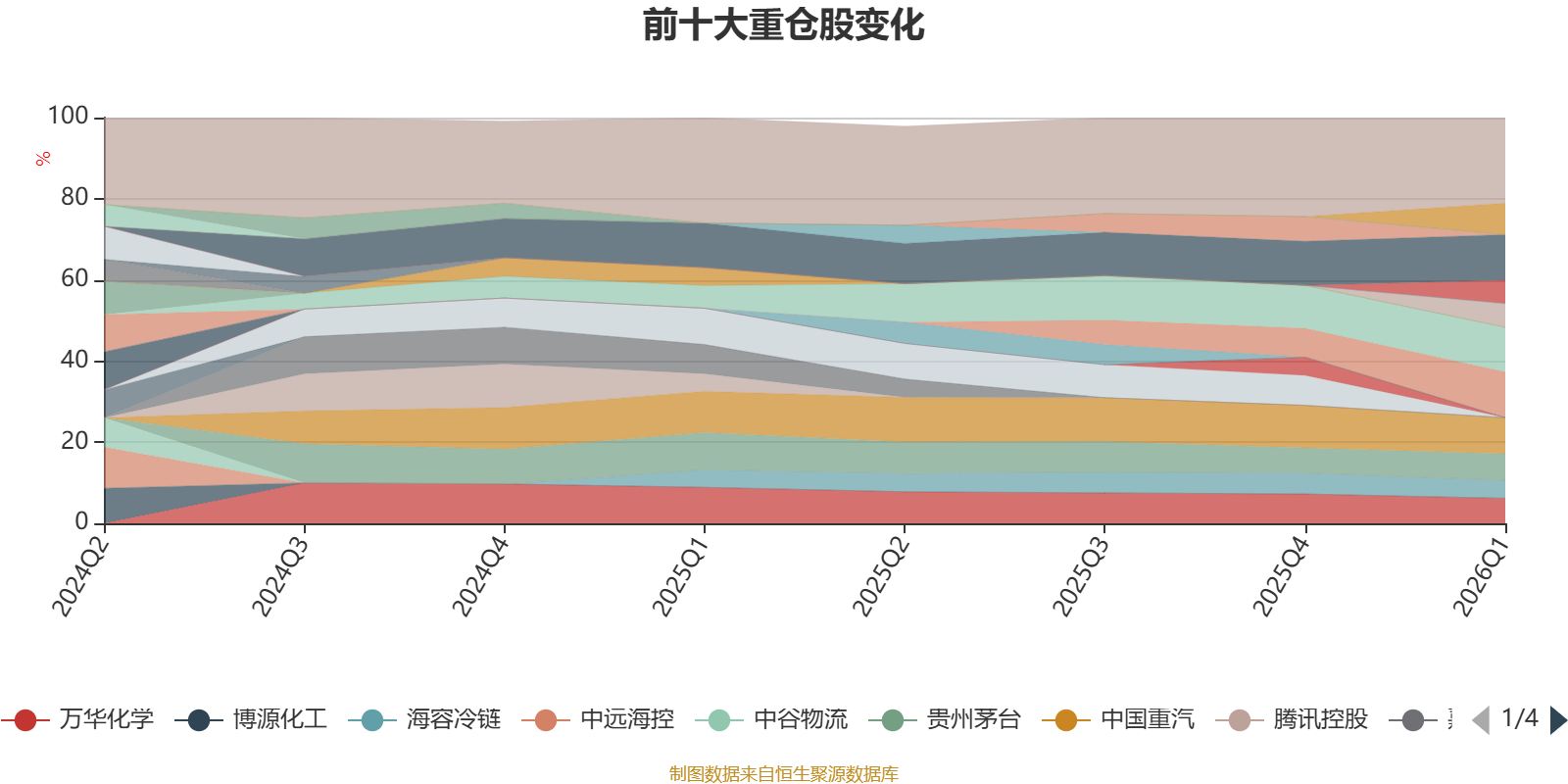 该基金持股集中度较高,近2年前十大重仓股集中度长期超过60%。截至2026年一季度末,基金十大重仓股分别是美的集团、宁波银行、青岛港、中国重汽、宇通客车、贵州茅台、万华化学、齐鲁银行、中国太保、海容冷链。