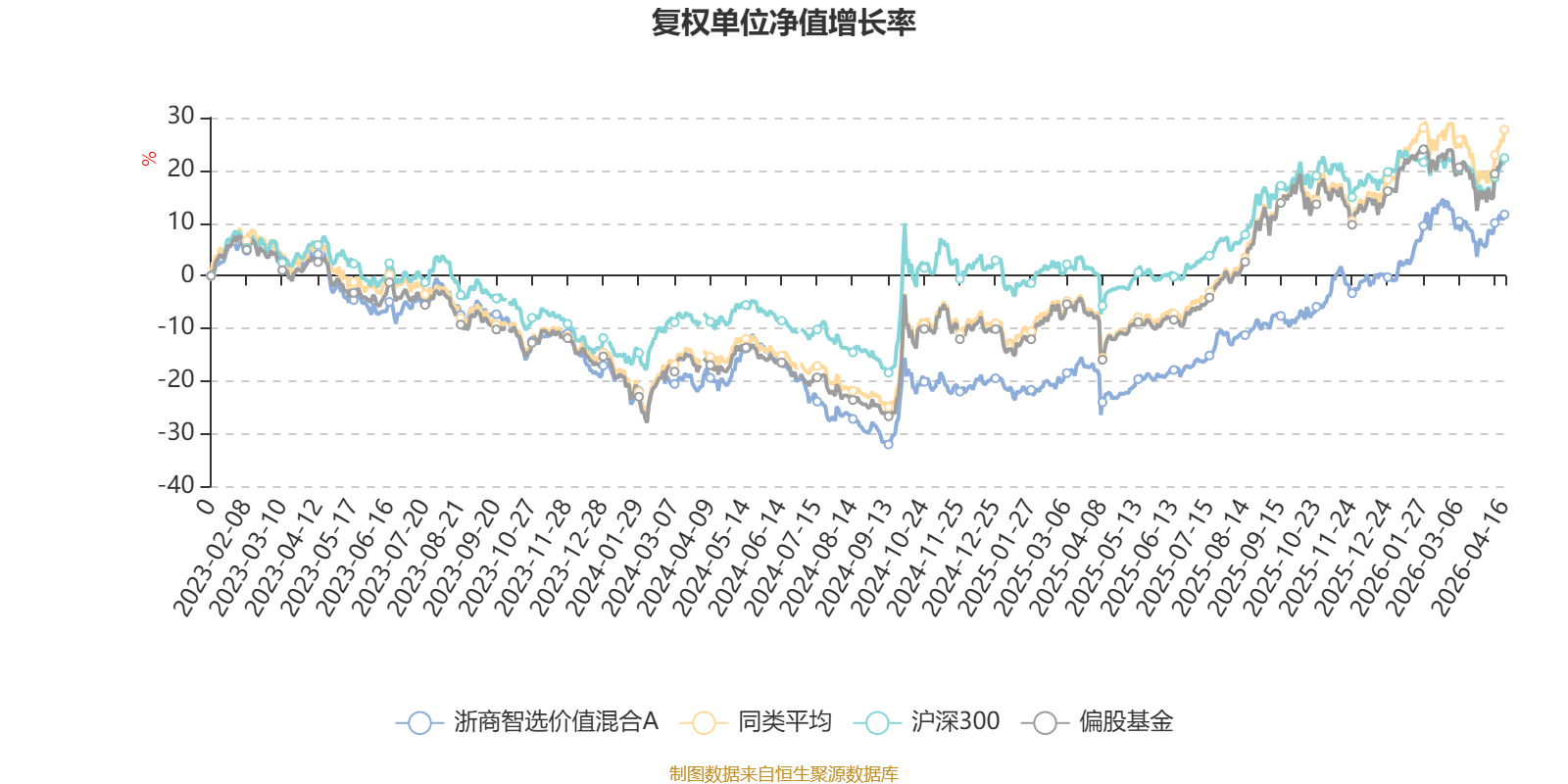 截至4月16日,浙商智选价值混合A近三个月复权单位净值增长率为7.94%,位于同类可比基金47/265;近半年复权单位净值增长率为19.52%,位于同类可比基金49/265;近一年复权单位净值增长率为45.66%,位于同类可比基金110/265;近三年复权单位净值增长率为7.65%,位于同类可比基金199/261。