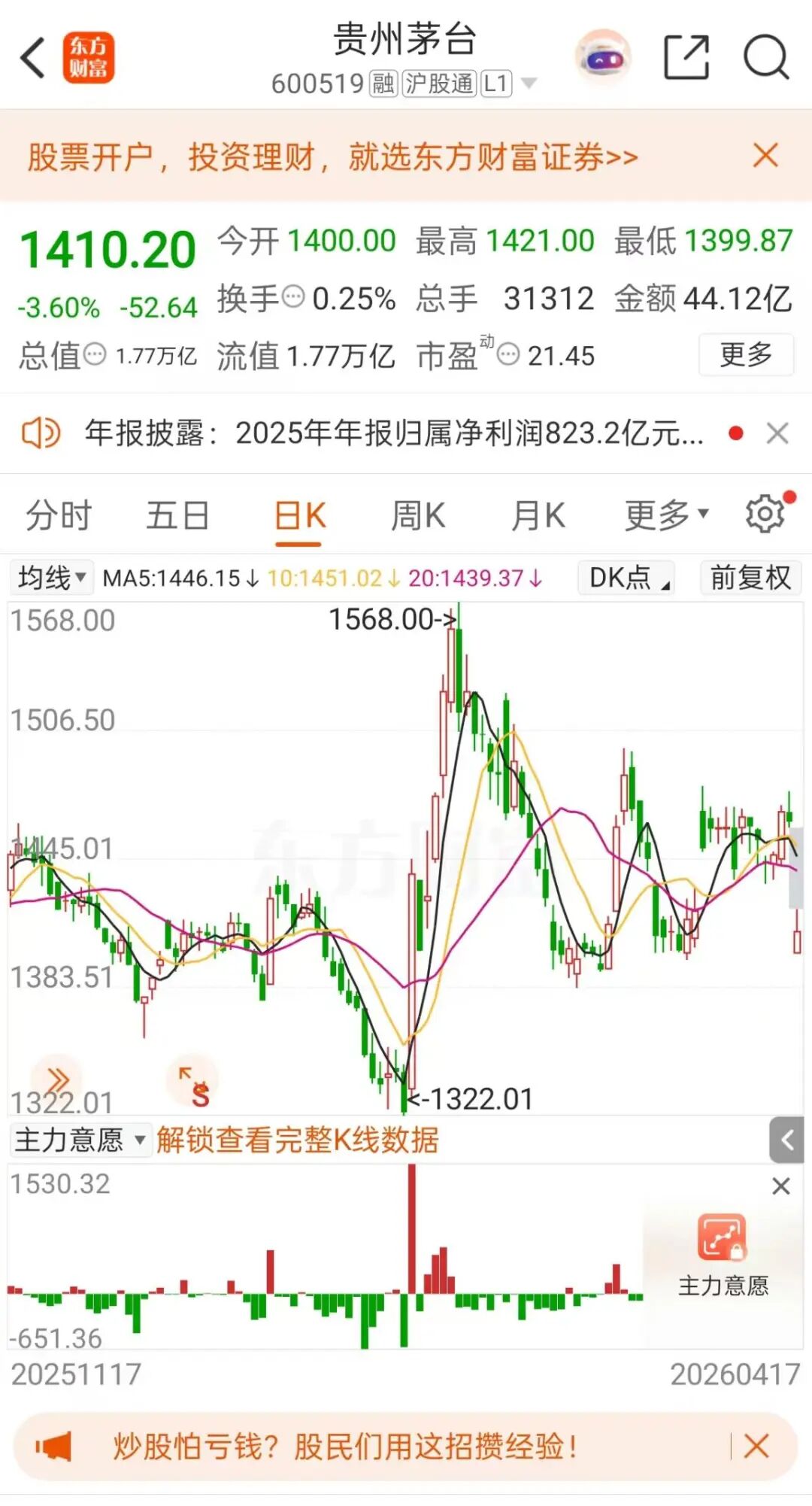 4月17日,受业绩负增长影响,贵州茅台股价表现承压。当日,公司股价低开超4%,险守1400元关口。