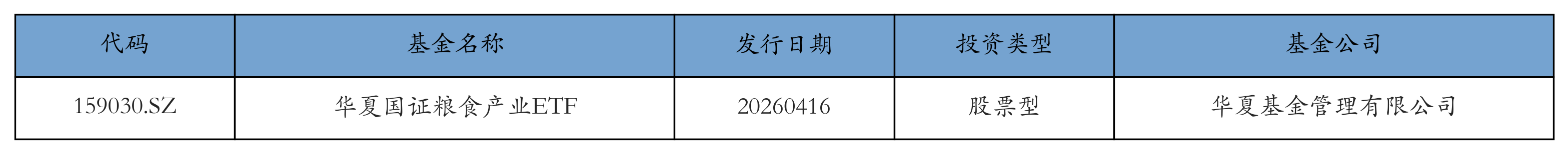 昨日有1只新基金发行,分别为:华夏国证粮食产业ETF,详情见下表: