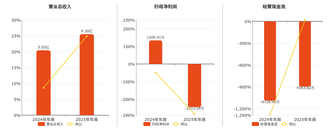 公司营业总收入为6.30亿元。归母净利润为-2212.24万元,较去年同报告期归母净利润减少3412.65万元,同比较去年同期下降284.29%。经营活动现金净流入为-5543.82万元。