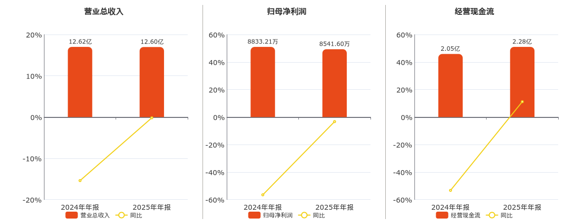 公司营业总收入为12.60亿元,较去年同报告期营业总收入减少221.70万元,同比较去年同期下降0.18%。归母净利润为8541.60万元,较去年同报告期归母净利润减少291.61万元,同比较去年同期下降3.30%。经营活动现金净流入为2.28亿元。