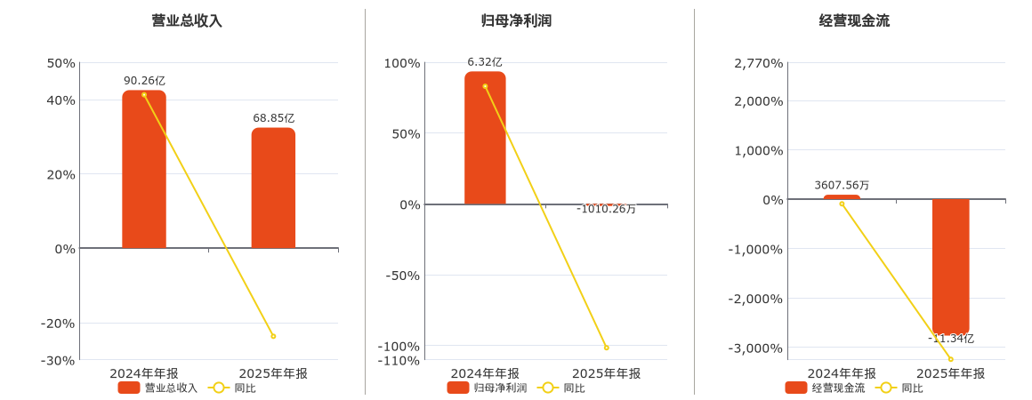公司营业总收入为68.85亿元,较去年同报告期营业总收入减少21.41亿元,同比较去年同期下降23.72%。归母净利润为-1010.26万元,较去年同报告期归母净利润减少6.42亿元,同比较去年同期下降101.60%。经营活动现金净流入为-11.34亿元,较去年同报告期经营活动现金净流入减少11.70亿元,同比较去年同期下降3242.53%。
