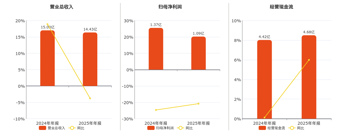 公司营业总收入为14.43亿元,在已披露的同业公司中排名第26,较去年同报告期营业总收入减少5681.84万元,同比较去年同期下降3.79%。归母净利润为1.09亿元,在已披露的同业公司中排名第25,较去年同报告期归母净利润减少2852.77万元,同比较去年同期下降20.80%。经营活动现金净流入为4.68亿元,在已披露的同业公司中排名第26。