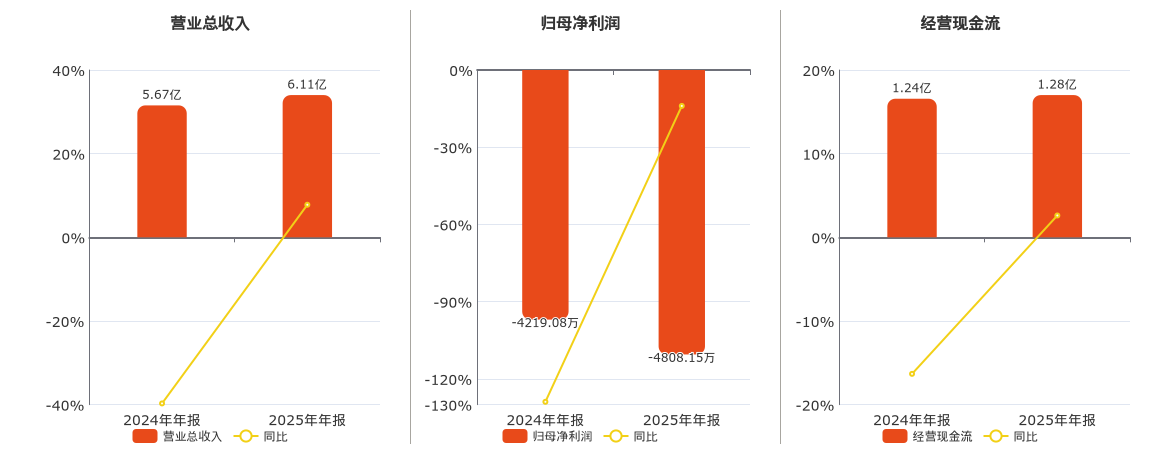 公司营业总收入为6.11亿元。归母净利润为-4808.15万元,较去年同报告期归母净利润减少589.06万元。经营活动现金净流入为1.28亿元。