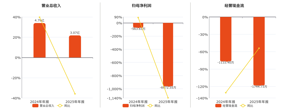 公司营业总收入为3.07亿元,较去年同报告期营业总收入减少1.72亿元,同比较去年同期下降35.88%。归母净利润为-6972.55万元,较去年同报告期归母净利润减少6408.94万元。经营活动现金净流入为-1744.73万元,较去年同报告期经营活动现金净流入减少611.33万元。