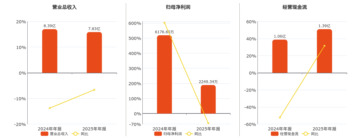 公司营业总收入为7.83亿元,较去年同报告期营业总收入减少5564.79万元,同比较去年同期下降6.63%。归母净利润为2249.34万元,较去年同报告期归母净利润减少3927.26万元,同比较去年同期下降63.58%。经营活动现金净流入为1.39亿元。