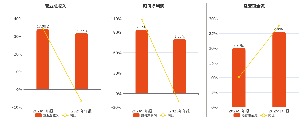 公司营业总收入为16.77亿元,较去年同报告期营业总收入减少1.20亿元,同比较去年同期下降6.69%。归母净利润为1.83亿元,较去年同报告期归母净利润减少3209.94万元,同比较去年同期下降14.92%。经营活动现金净流入为2.84亿元。
