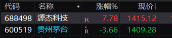 个股表现方面,今天上午盘中A股市场出现新“股王”: 源杰科技盘中超越贵州茅台,跻身A股市场第一高价股。