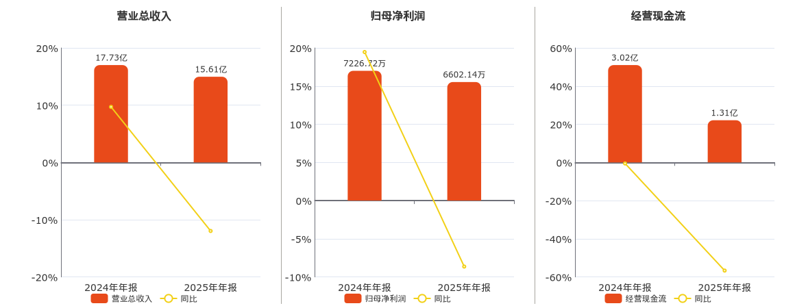 公司营业总收入为15.61亿元,较去年同报告期营业总收入减少2.12亿元,同比较去年同期下降11.97%。归母净利润为6602.14万元,较去年同报告期归母净利润减少624.59万元,同比较去年同期下降8.64%。经营活动现金净流入为1.31亿元,较去年同报告期经营活动现金净流入减少1.71亿元,同比较去年同期下降56.66%。