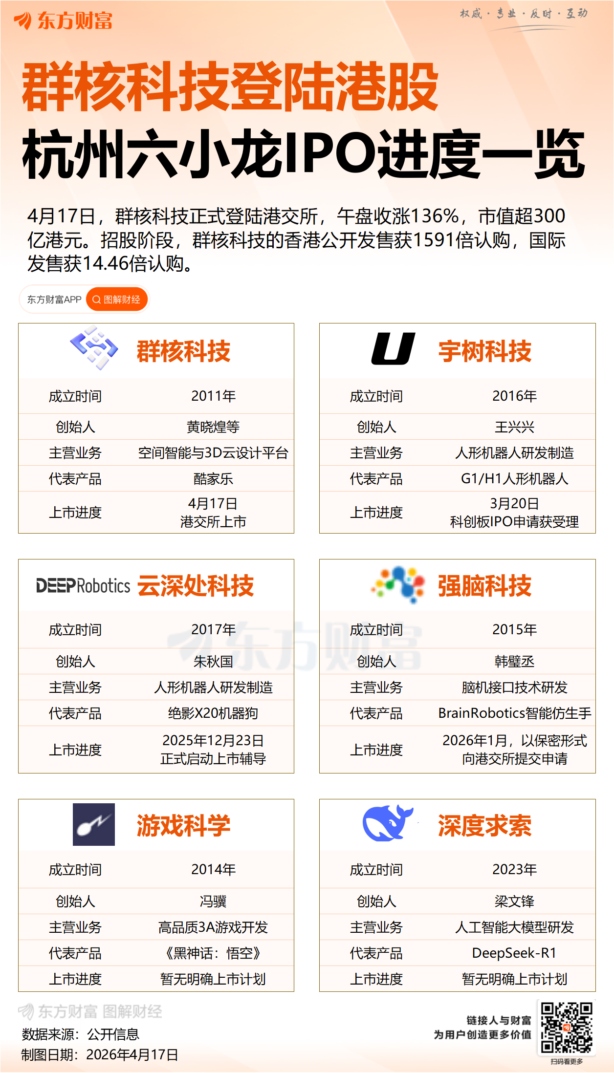 除了群核科技率先上市,其余"六小龙"成员亦在积极推进资本化进程。宇树科技科创板IPO已获受理;云深处科技于2025年12月向浙江证监局递交IPO辅导材料,辅导期预计于2026年4月至6月结束,最早将于年中迈出A股申报第一步;强脑科技据媒体报道已向港交所秘密提交IPO申请。