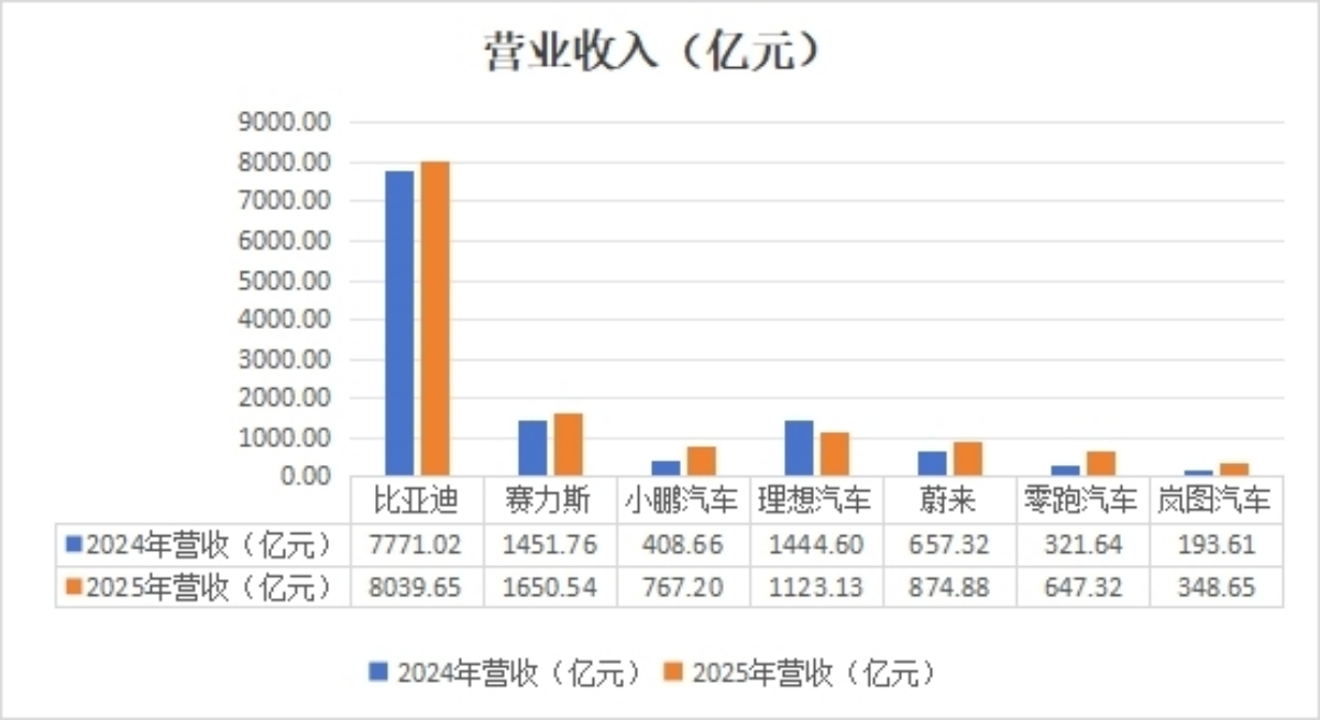 2025年,七大新能源车企营收分化明显,其中比亚迪以绝对规模优势领跑全行业;赛力斯营收位列第二,盈利表现稳健。