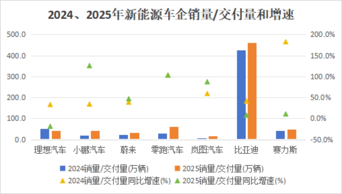 小鹏汽车和零跑汽车2025年的交付量同比增速均超过100%,实现翻倍增长,成为行业增长亮点。
