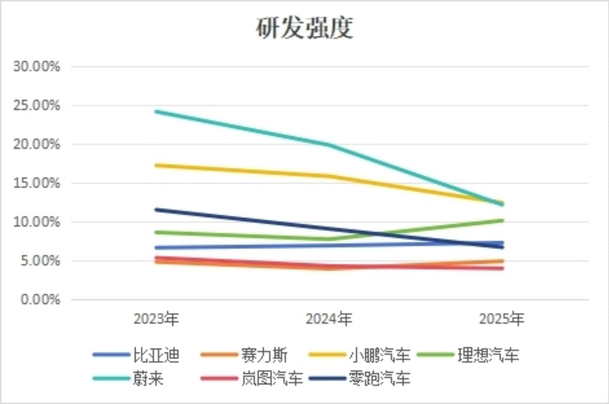 从研发强度(研发费用/营业收入)来看,“蔚小理”位居前列。2025年,小鹏汽车研发强度为12.37%,蔚来为12.12%,理想汽车为10.07%。比亚迪(7.21%)与零跑汽车(6.63%)位列第二梯队,赛力斯(4.82%)与岚图汽车(3.90%)的研发强度在七家中相对较低。从变化趋势看,小鹏汽车、蔚来、零跑汽车、岚图汽车四家研发强度同比下降,其中蔚来、小鹏汽车、零跑汽车降幅较为明显;比亚迪、赛力斯、理想汽车则有所上升。