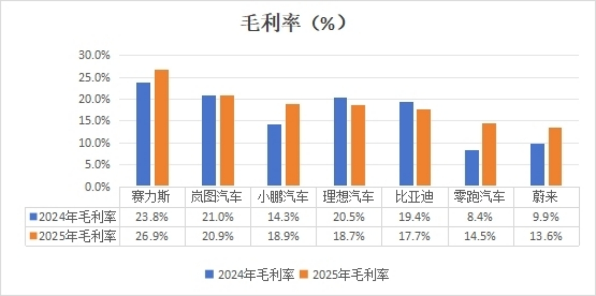 从毛利率来看,2025年,赛力斯以26.9%的毛利率遥遥领先,小鹏汽车、零跑汽车、蔚来毛利率分别提升至18.9%、14.5%和13.6%,改善幅度较为明显。相比之下,理想汽车、比亚迪与岚图汽车毛利率均出现下滑,其中理想汽车由20.5%回落至18.7%,降幅相对较大。