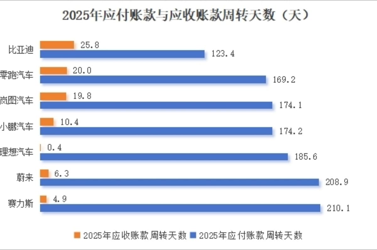 与之相反,小鹏汽车、岚图汽车应付账期则明显降低。2025年,小鹏汽车应付账款周转天数从232.8天降至174.2天,降幅超58天;岚图汽车从199.7天降至174.1天,缩短约25天。比亚迪的应付账款周转天数相对稳定,从127.2天微降至123.4天,在七家中处于最低水平。