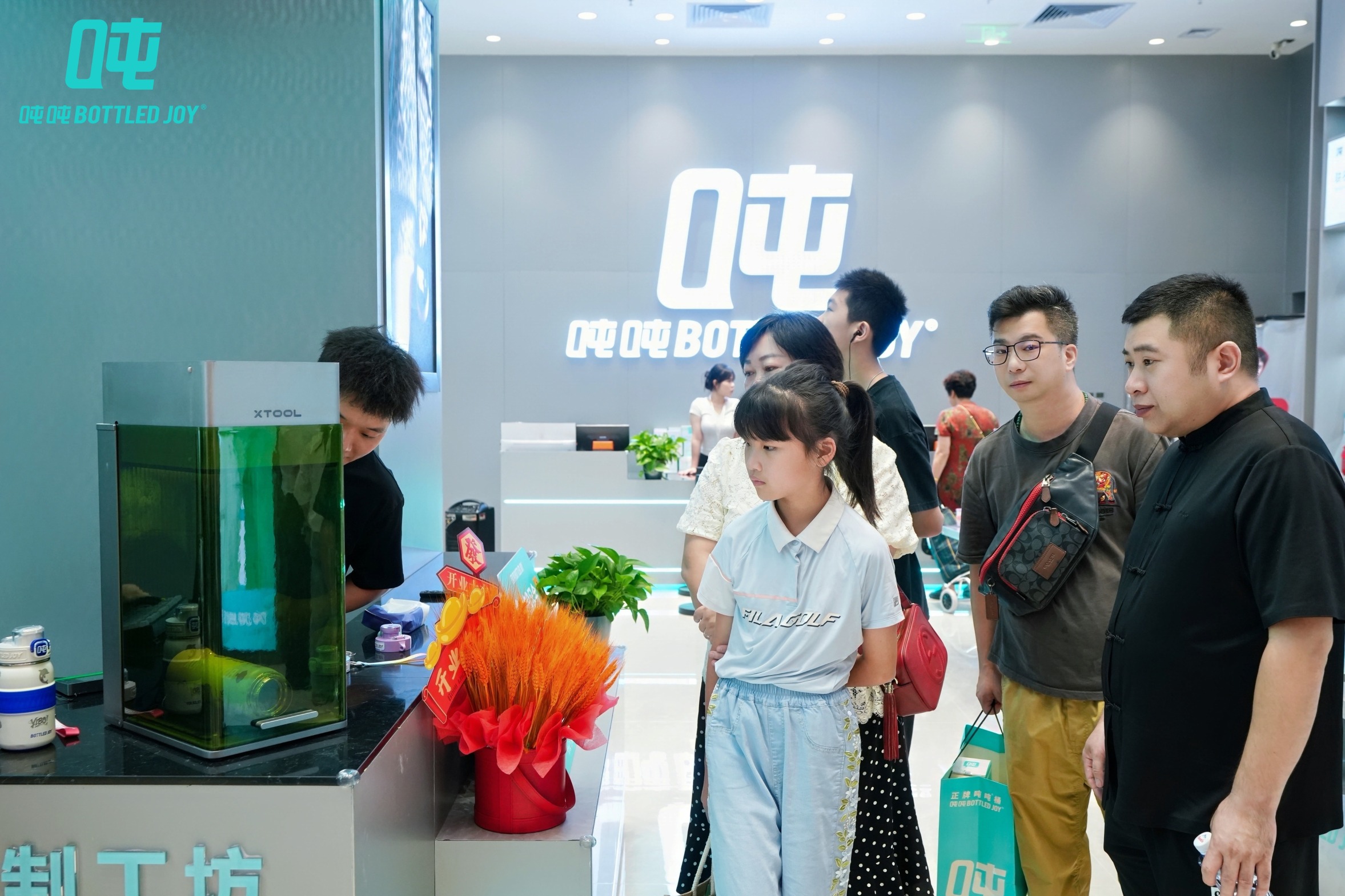 这必须在工厂或实验室完成吗?不,xTool早已让激光雕刻机走出工厂,进入商场,出现在华为智能生活馆、Stanley 快闪店、霸王茶姬、星巴克等40余个头部品牌的2000多家线下门店里。购买现场就可在耳机、水杯、皮革上刻下名字、图案与故事,收获独一无二的私人订制。