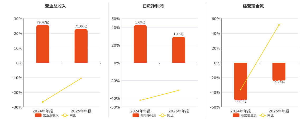 公司营业总收入为71.06亿元,较去年同报告期营业总收入减少8.41亿元,同比较去年同期下降10.59%。归母净利润为1.16亿元,较去年同报告期归母净利润减少5266.32万元,同比较去年同期下降31.17%。经营活动现金净流入为-3.74亿元。